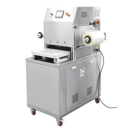 Semi-Automatic Tray Sealing machine equipped with units for vacuum and/or gas injected packages. This type of machine is exclusively aimed at the food market.